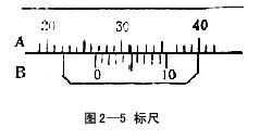 (8)推进器:位于镜台右下,连一弹簧标本夹,有大小两个左右移动手轮或旋钮(图 2-4)。转动手轮(旋钮)可调节推进器使玻片标本前后或左右移动。推进器上有纵横游标尺,用以测定标本在视野中的方位及其大小。游标尺一般由主标尺(A)和副标尺(B)组成。副标尺的分度为主标尺的 9/10。使用时,首先看副标尺的 O 点位置,然后看主副标尺的一致点。如图 2-5 所示,副标尺的 O 点在主标尺的 26 与 27 之间,副标尺的 6 与主标尺的 32 一致,即 6 与主标尺上的一个分度线正对,则此标尺所表示的数值为 26.6mm。