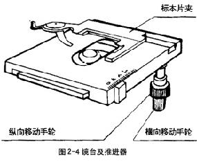 (7)镜台(载物台):与镜柱相连的方形平台,用以放置标本片(图 2-4)。镜台中央有一圆形或椭圆形的通光孔,照明电源产生的光线透过聚光镜经此射向标本,转动调节器可以升降载物台。