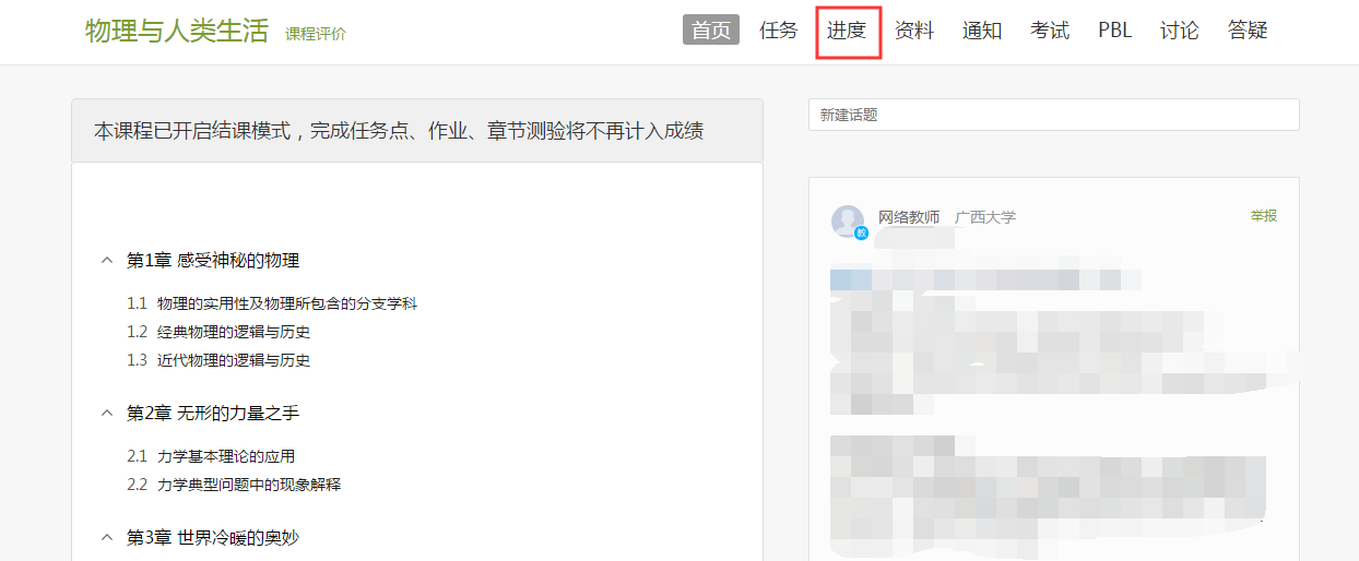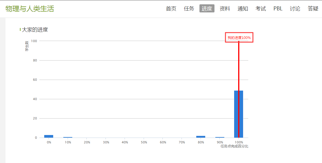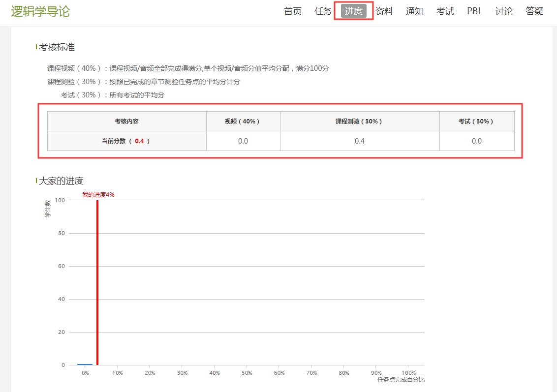 PC端:登录平台后,点击“进度”,可查看目前本人该课程的学习视频任务点和测验任务点的总进度。