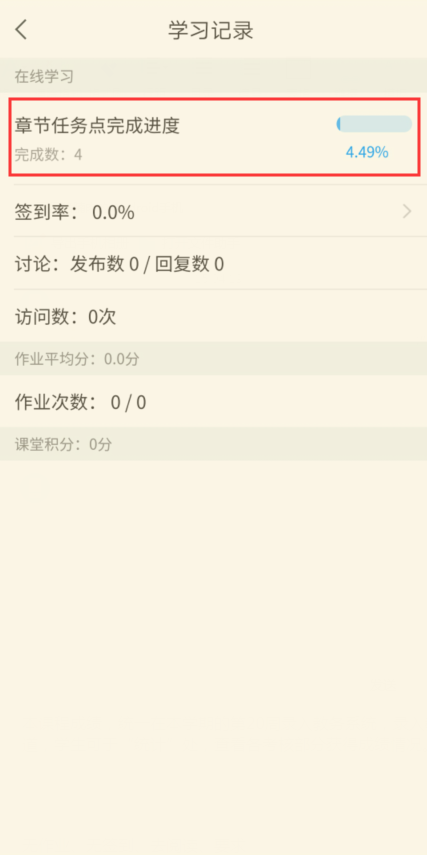 注意:“学习记录”页面显示的“签到率”“访问数”“作业次数”“课堂积分”等内容均不是本课程的考核项,请忽略。
