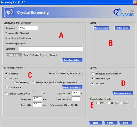 C. Screening Experiment部分:选择Two scans选项和Reliable resolution limit and exp. timeprediction选项。采用默认设置: exposure time (20), resolution(2.0), scan width(0.5).