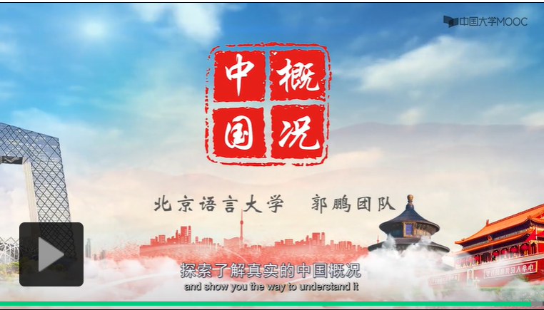 《中国概况》(https://www.icourse163.org/course/BLCU-1206638814)是北京语言大学在中国大学MOOC平台推出的在线课程,适用于来华留学生、海外汉语学习者、对中国文化感兴趣的学习者。