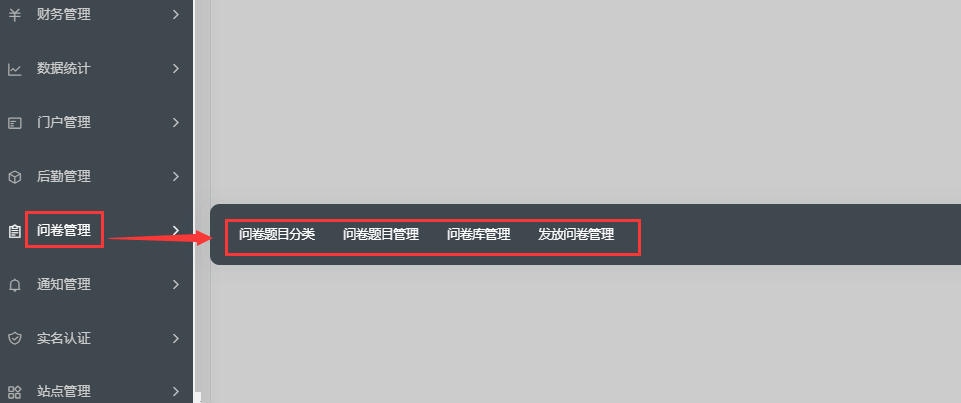 问卷管理包括问卷题目分类, 题目、问卷库及发放问卷管理。可以进行题目的分类设置,题目的相关增删改查功能,以及问卷库的操作,提供发放问卷的管理。