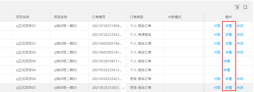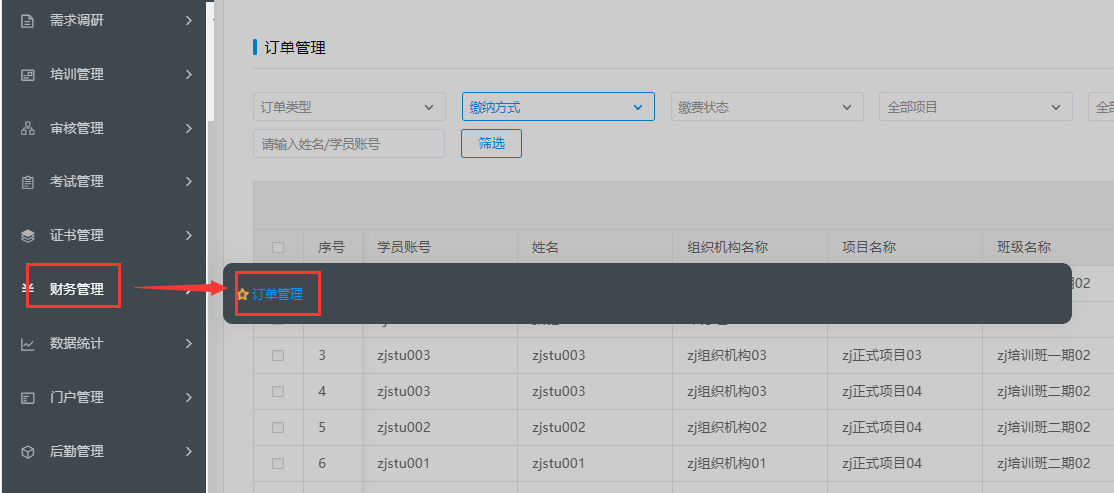 财务管理支持对生成的订单管理,实现对缴费信息的统计查看,完成付现或关闭功能。