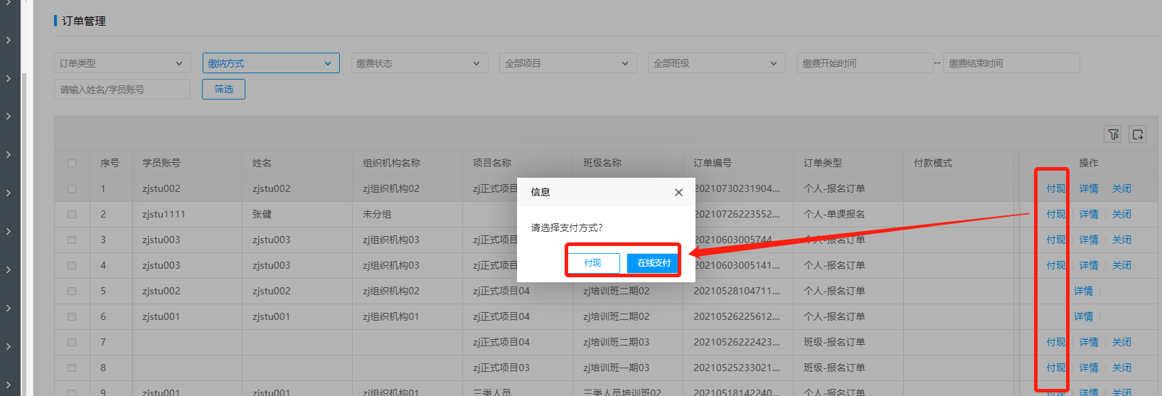选择对应操作栏中的付现,可进行现金或在线支付。
