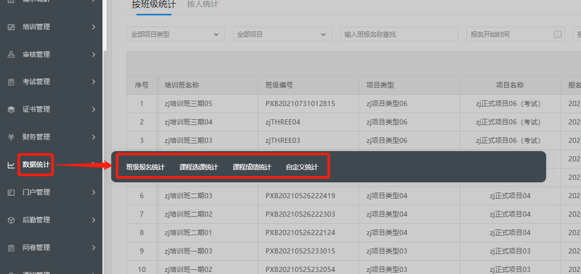 数据统计模块支持对包括班级的报名情况、选课情况和课程成绩进行统计,并可以自定义需要统计的维度生成图表。