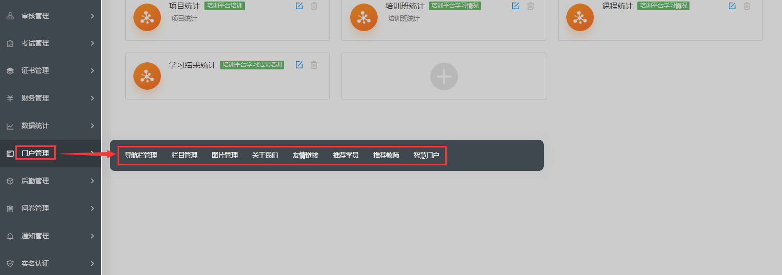 门户管理模块包括导航栏管理、栏目管理、图片管理、关于我们、友情链接、推荐学员、推荐教师、智慧门户八个部分,显示在门户界面。通过导航栏配置显示在门户的导航;栏目管理通过不同栏目提供项目接口;并可以在此模块管理门户图片和推荐信息、相关链接等。