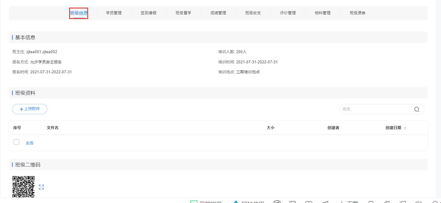 点击班级信息,查看开班信息和班级资料本地上传,学员可通过扫描二维码进行报道。