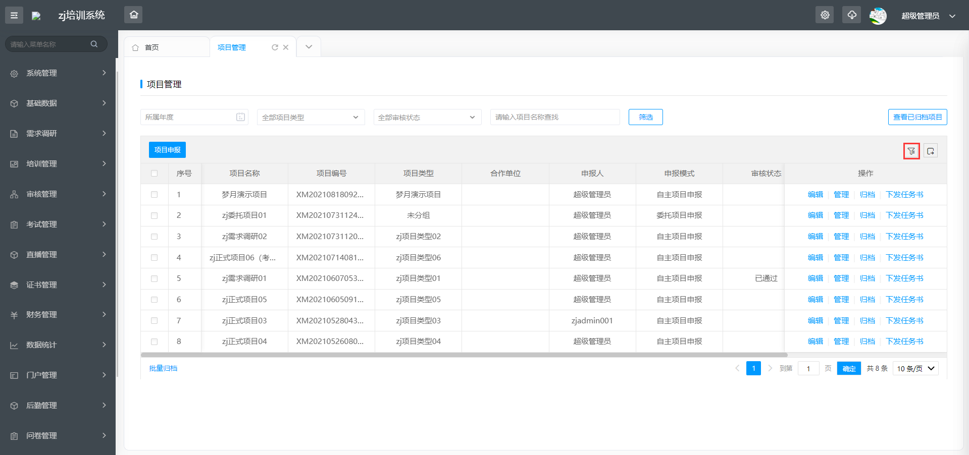 不同的查询页面根据实际业务和查询内容,都有不同的筛选条件,在项目管理查询页面包括所属年度、项目类型,审核状态,项目名称等筛选项。根据查找的内容进行筛选,可精准定位项目信息。