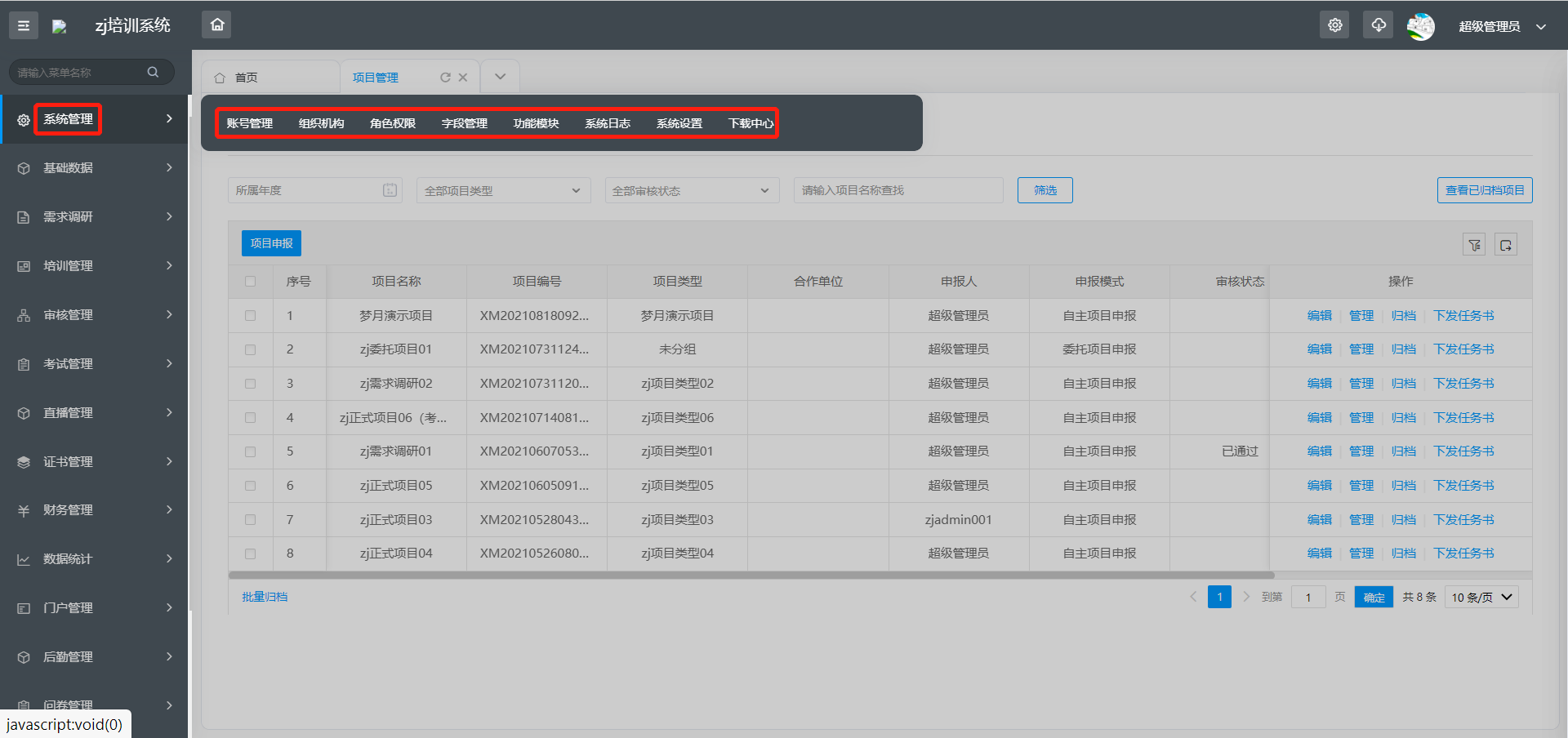 本模块包含账号管理、组织机构、角色权限、字段管理、功能模块、系统日志、系统设置、下载中心。对管理员账号、组织机构、权限和字段进行增删改查设置和管理;对不同的角色分配权限,显示不同的功能模块;进行系统的基础设置以及包括通知、节次和缴费的设置。
