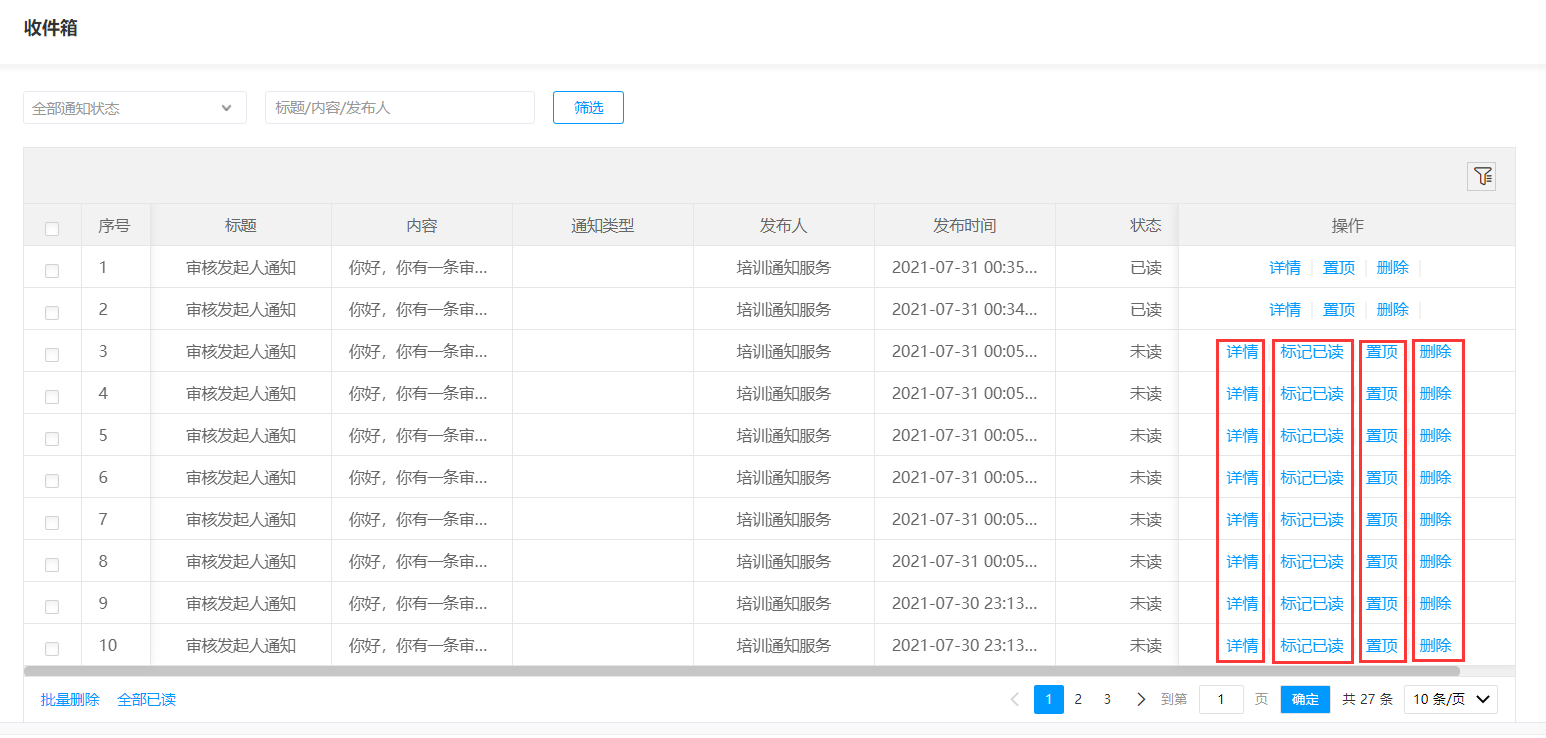 进入收件箱,选择详情可看到收到的通知内容;对于未读通知可标记已读;也可指定通知选择置顶;以及可以对通知进行删除。