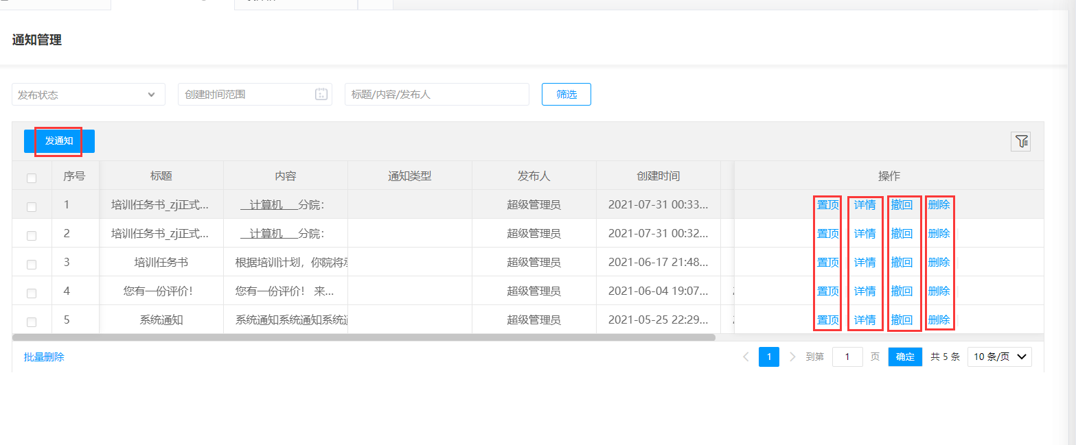 在通知管理界面,点击发通知,可以进行通知的发放;点击置顶,将通知在通知列表置顶;点击详情可以看到通知内容及发送对象等情况;点击撤回将发送的通知撤回;选择删除可删除指定通知。