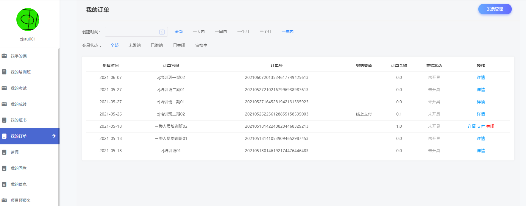 进入我的订单,对于报名产生的订单进行查看,同时可以对未缴费订单缴费或关闭。