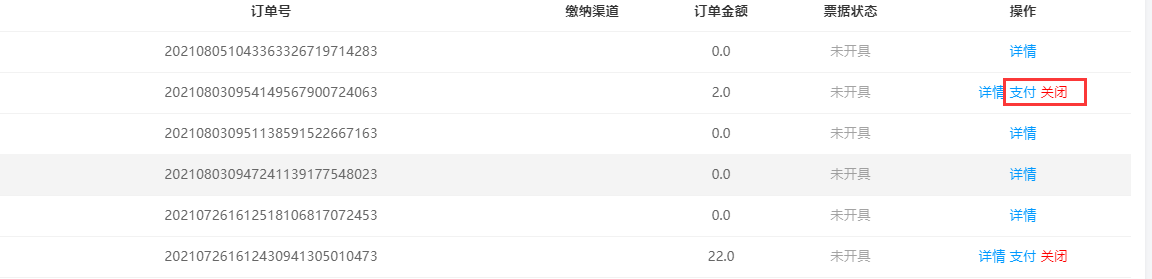 对于未缴费订单,可以选择支付,选择付现或在线支付,跳转支付界面;或者关闭该笔订单。