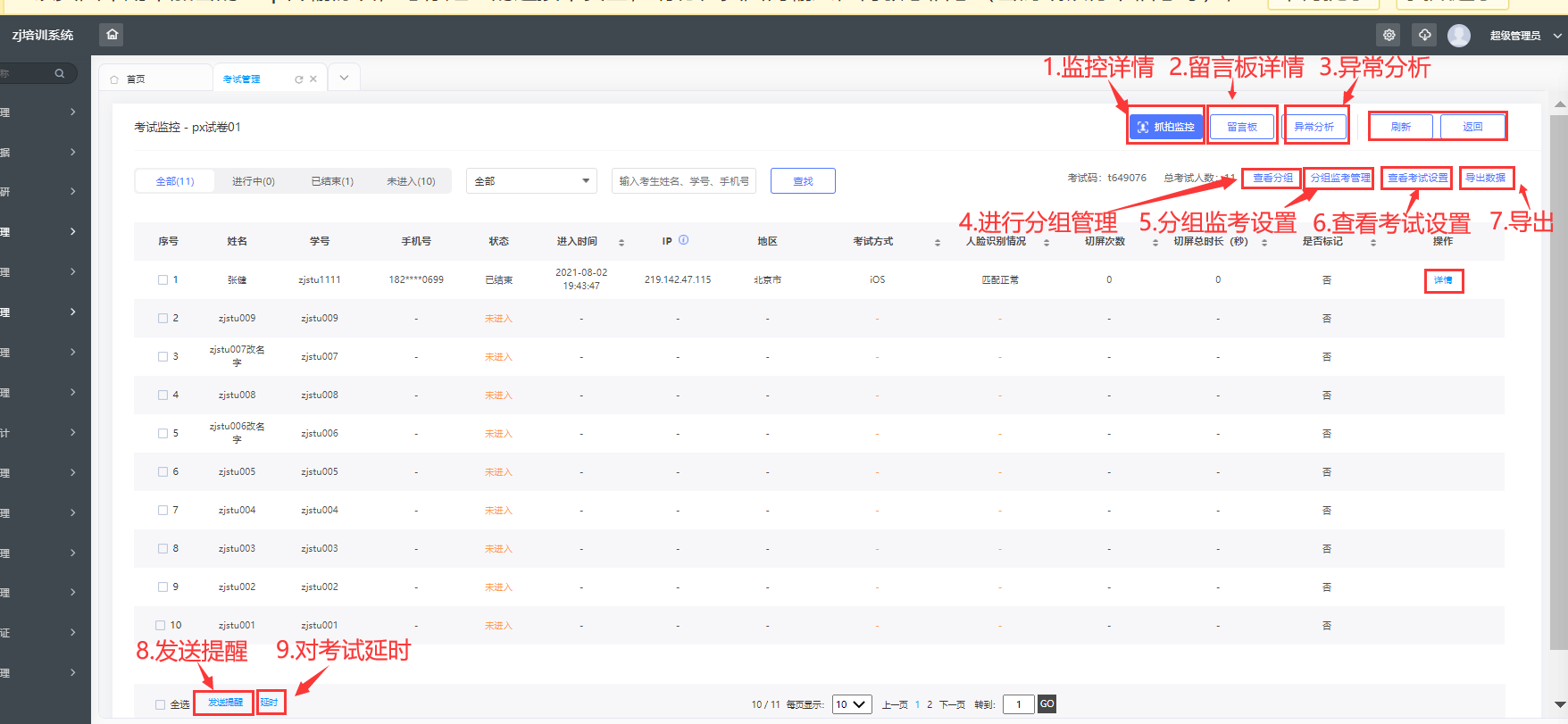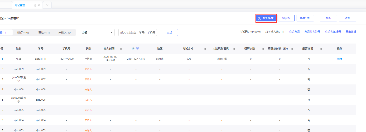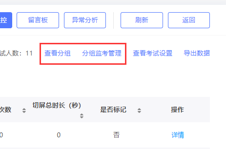 如下图所示,在该界面可进行对抓拍情况、留言详情的查看,考试异常总结;以及对考试学员进行分组,并进行不同组别的监考设置;可以查看考试的基础设置;对学员进行提醒和考试延时。
