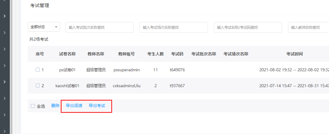 如下图所示,可导出单场考试/全部考试成绩,或导出考试。