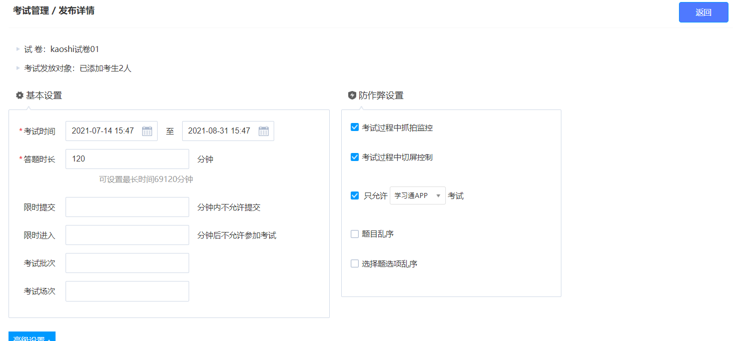 点击查看考试设置,可以看到并修改考试的基础设置。