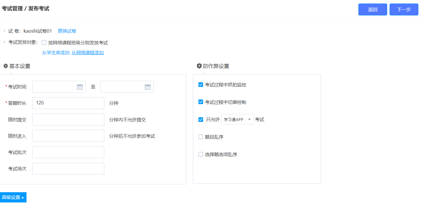 5) 考试设置