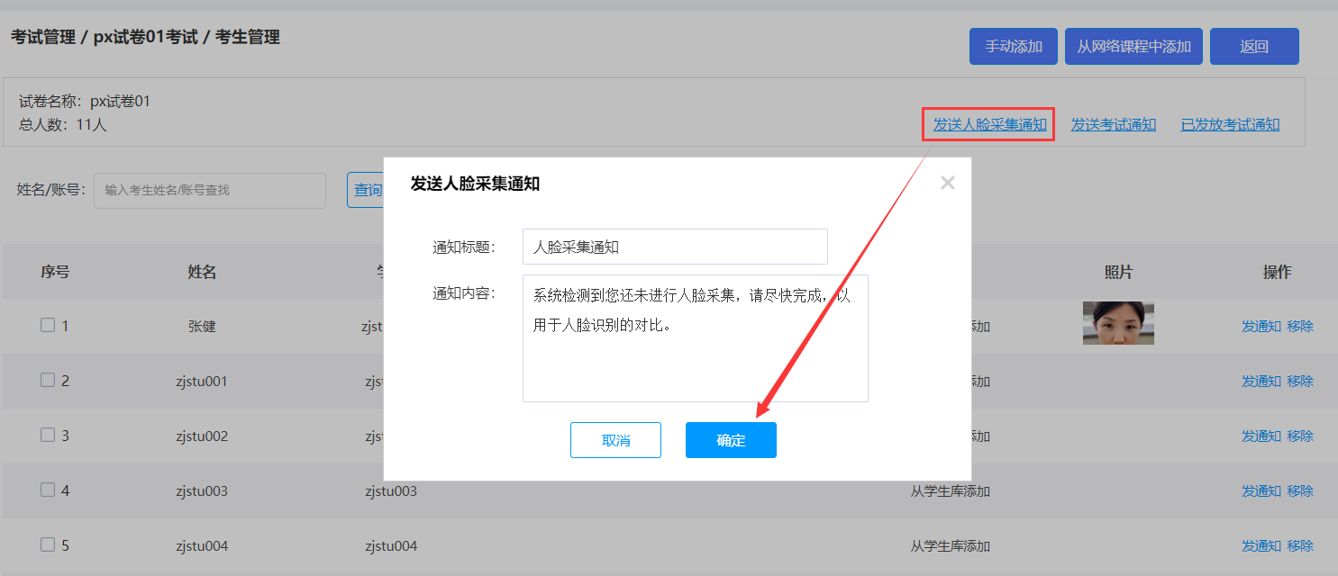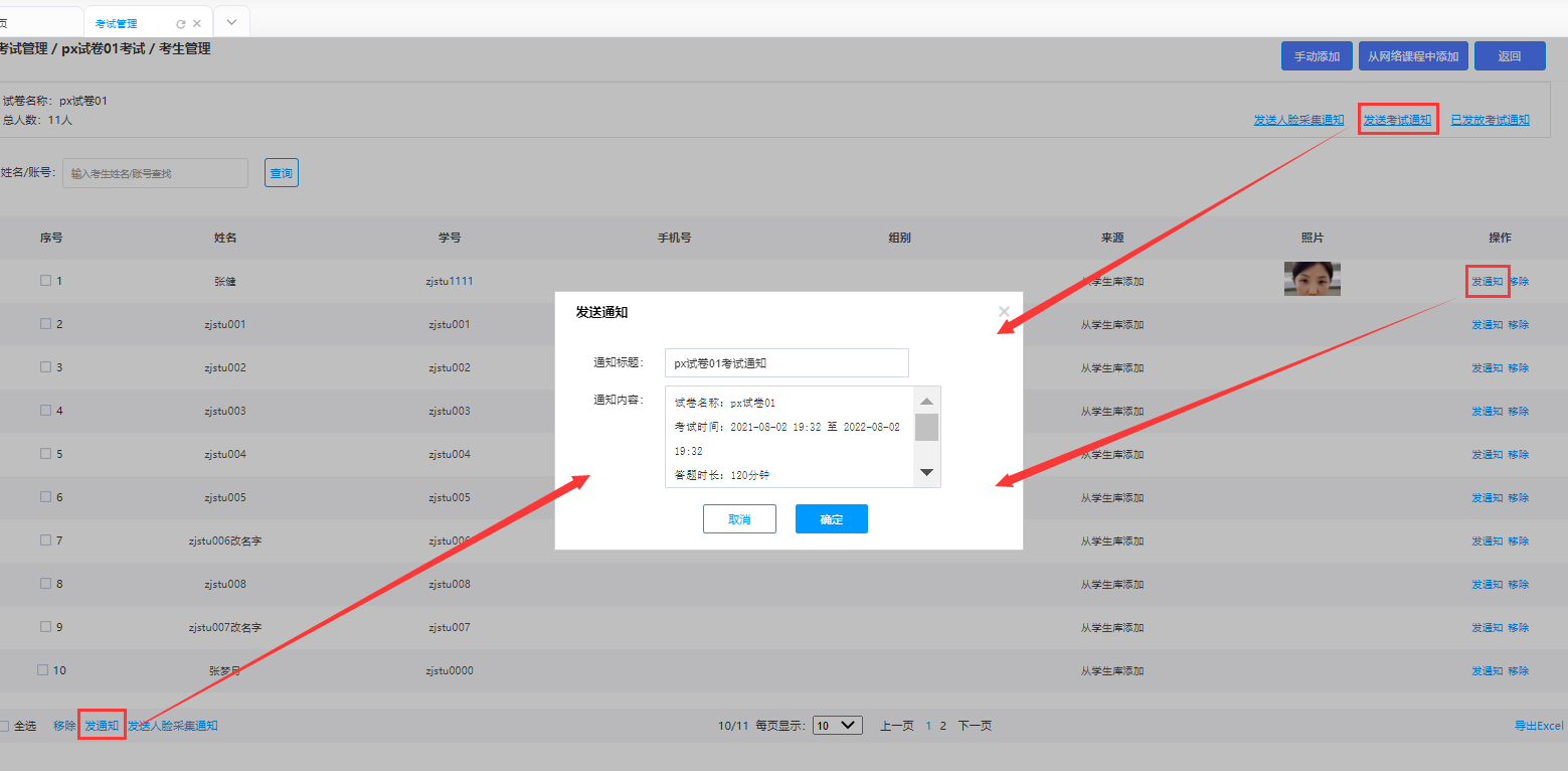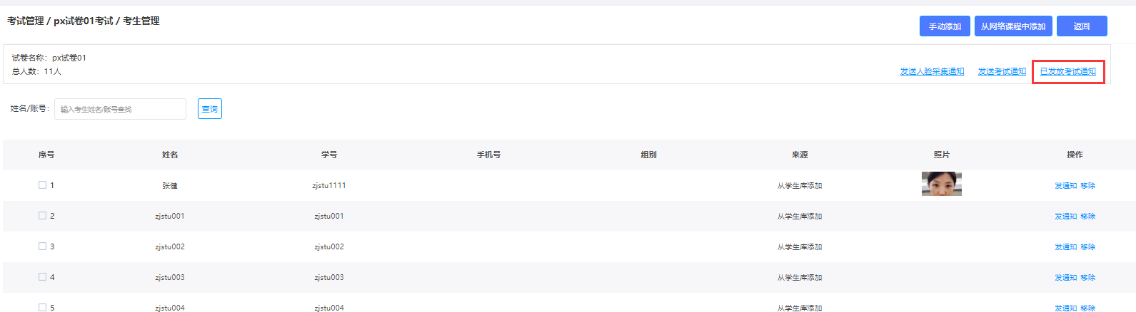 在考生管理中,可进行学员的添加、发送包括人脸采集和考试的通知,以及查看已发放的考试通知,并对学员进行删除操作。