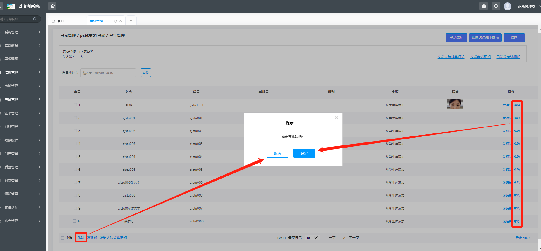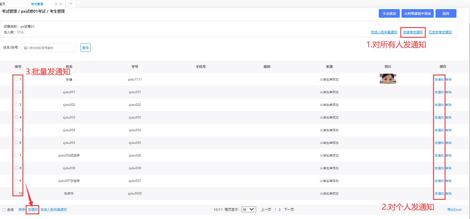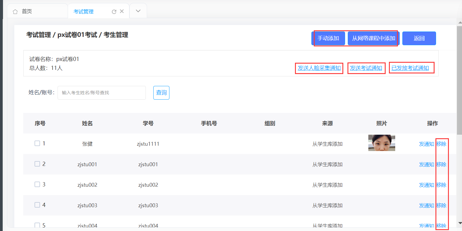 在考生管理中,可进行学员的添加、发送包括人脸采集和考试的通知,以及查看已发放的考试通知,并对学员进行删除操作。