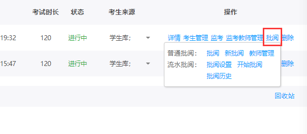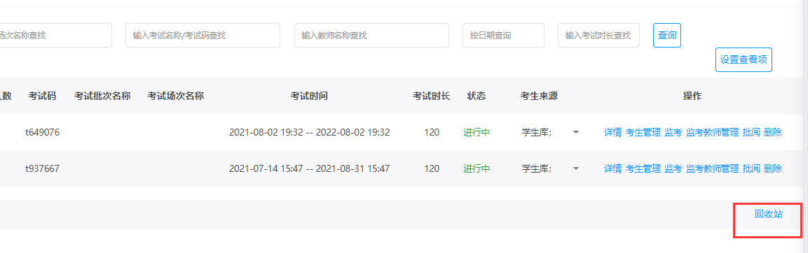 点击回收站,通过页面跳转查看删除的考试情况。