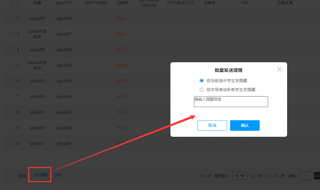 点击发送提醒,对指定考生进行提醒。
