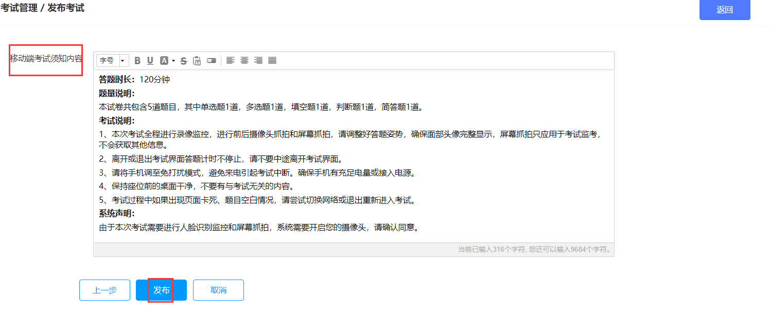 第三步:进行考试须知编辑,完成后发布考试。