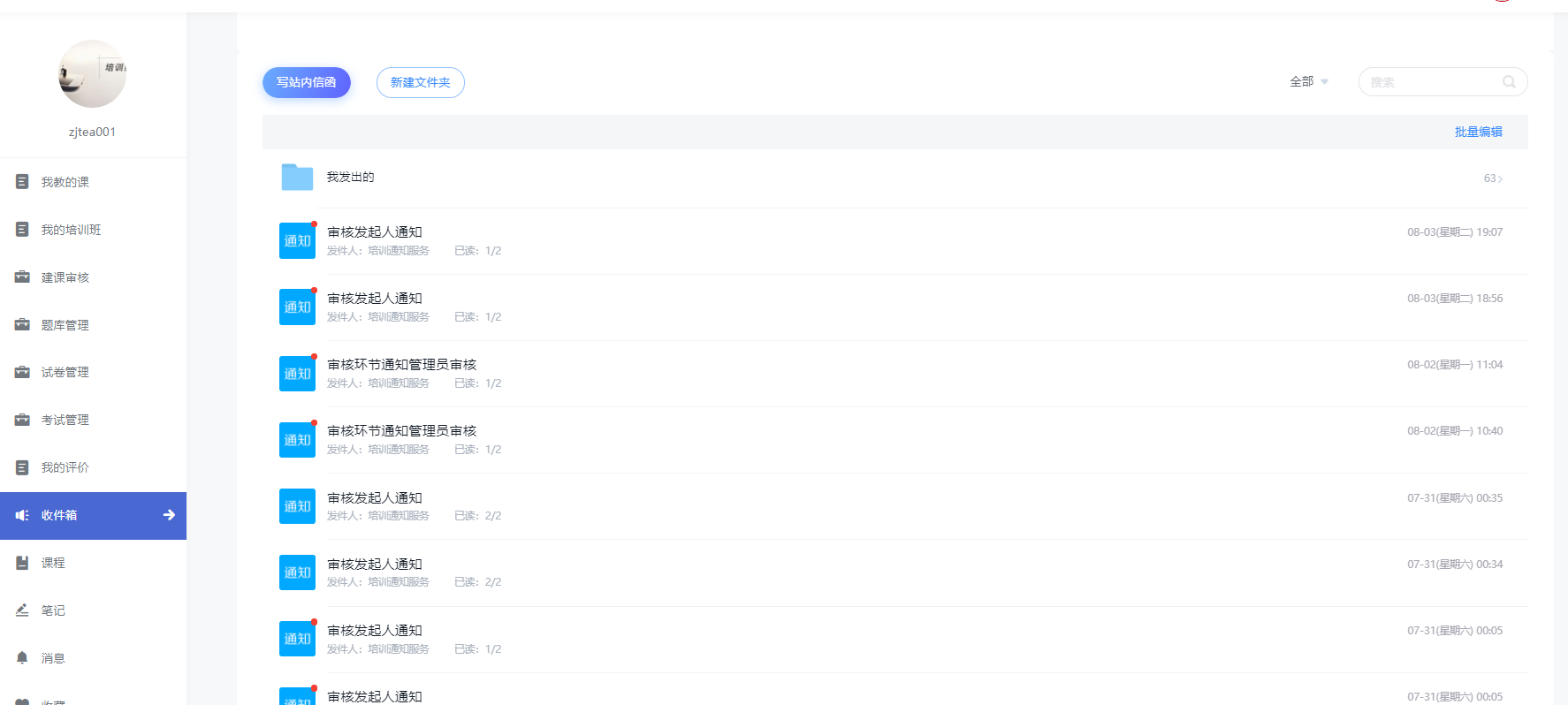 可查看发出及收到的通知,也可选择发送站内信函。