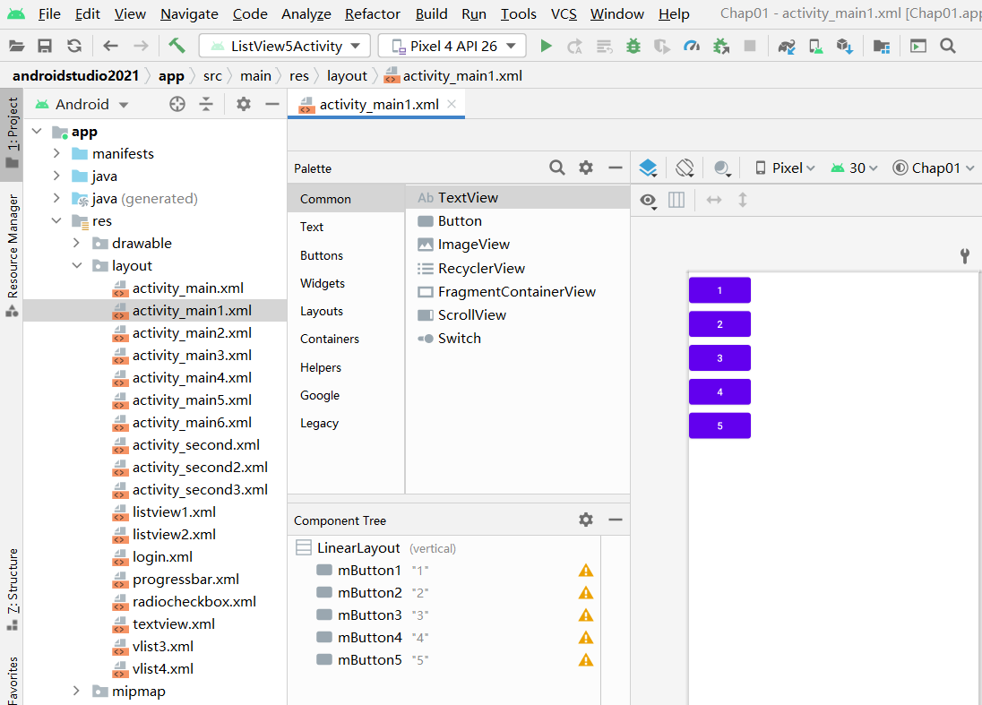 UI设计是本章的重点,图1-1展示了本章案例涉及的布局文件。通常一个项目需要多个界面,几乎每个界面都有对应的XML布局文件。