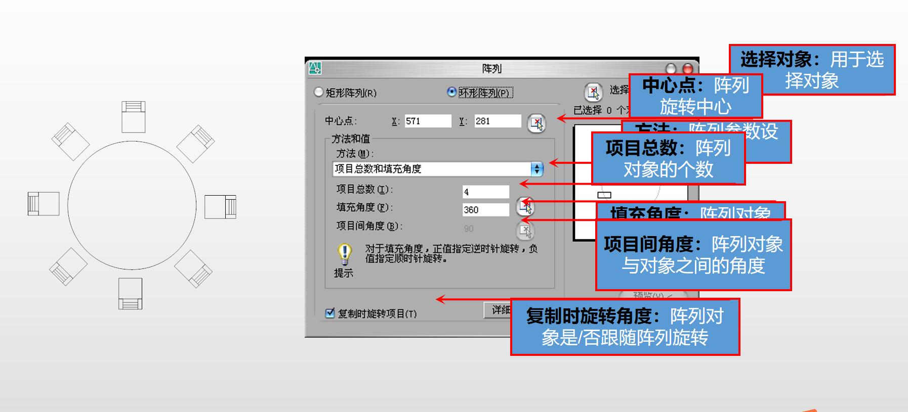 环形阵列,用户需要指定复制对象的数目以及对象是否旋转。