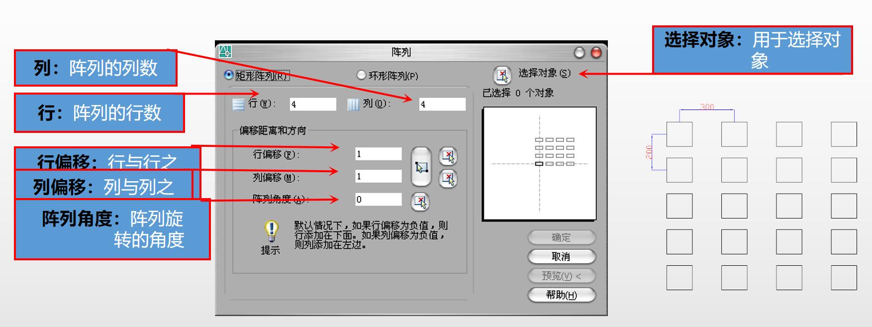 矩形阵列,用户需要指定行和列的数目、行或列之间的距离以及阵列的旋转角度。