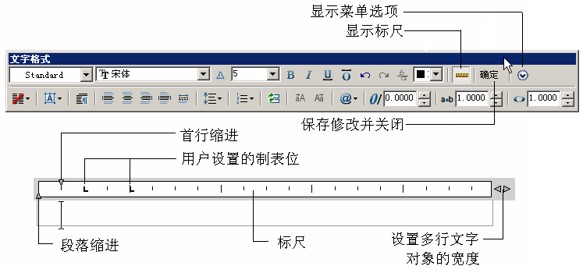 在位文字编辑器用于创建或修改多行文字对象,也可用于从其他文件输入或粘贴文字以创建多行文字。它包括了一个顶部带标尺的“文字输入”框和“文字格式”工具栏。