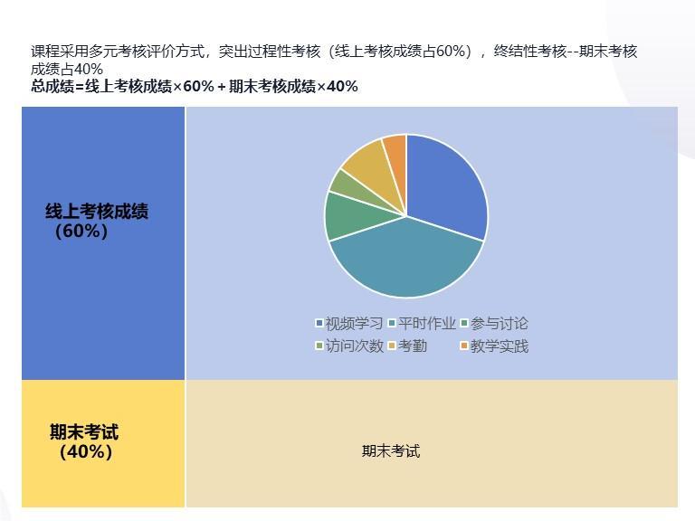 课程采用多元考核评价方式,突出过程性考核(线上考核成绩占60%),终结性考核--期末考核成绩占40%,即总成绩=线上考核成绩×60%+期末考核成绩×40%。