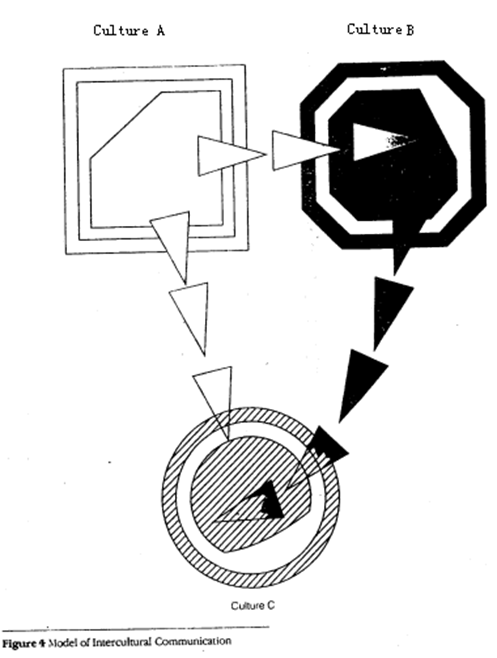 Two American scholars, Samovar and Porter, illustrated model of intercultural communication through the following picture. Culture A and culture B are closer in distance and similar in shape, one square, the other octagon. They bear more similarities compared with culture C, which is farther away and different in shape. So it will be easier for people from these two cultures to communicate with each other.