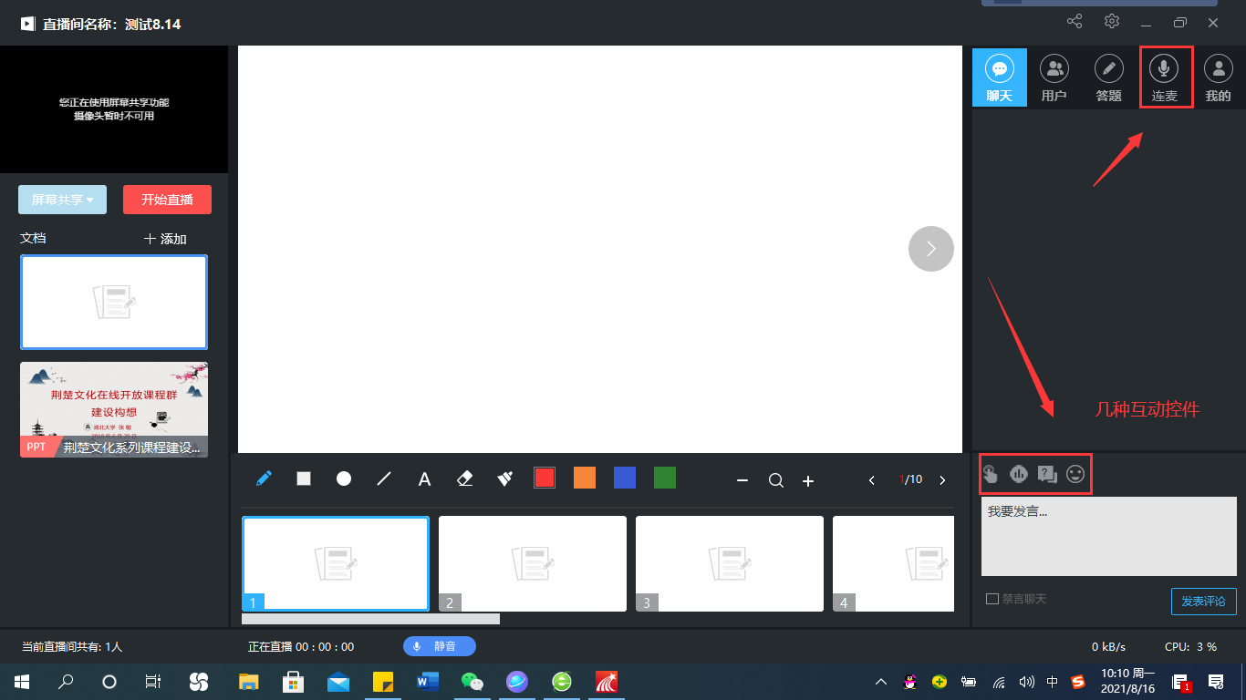 左侧上传教学文档(推荐pdf);如果需要展示PPT动画可以直接使用屏幕共享。