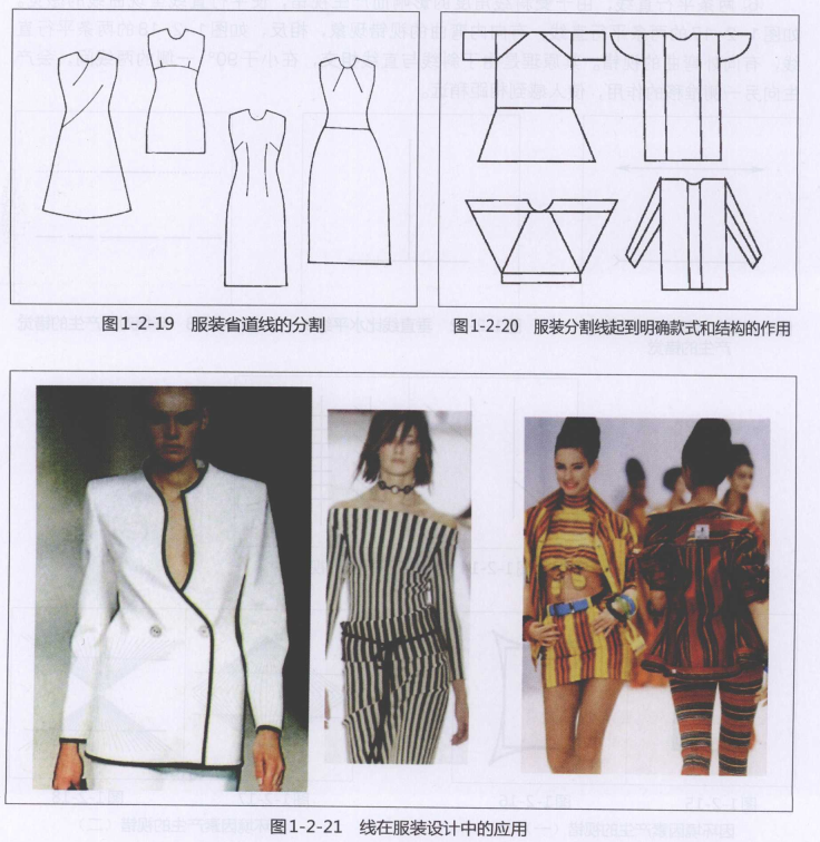 线在服装设计中有着极为重要的作用,它主要体现在服装结构线及服装装饰线的设计中。服装结构线主要是指公主线、背缝线、省道线等分割结构线(如图1-2-19、图1-2-20),除此以外还有领围线、胸围线、腰围线、臀围线、衣襟下摆线等(如图1-2-21)。在20世纪60年代,美国著名的服装设计师安德莱·克莱究创造了几何学线服装,克莱究的几何学线是一种建筑性的新的剪裁法,主要是将腰围线完全解放,有非常便于穿着的年轻的朝气蓬勃的造型感。服装结构线的设计是集装饰性与功能性于一体的线形设计,是服装设计基础训练中的重点与难点。服装装饰线设计则是将线的平面构成法则具体的应用到整装的设计中。