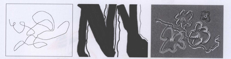 线是由点运动形成的,它是点的延伸与扩展,具有明确的方向性(如图1-2-1线是点的运动轨迹 )。线随着方向的不断改变呈现出丰富的视觉效果。线的形态特征主要表现在线的长度上,而长度是按照点的移动量来决定的,除了移动量之外,点的移动速度也支配着线的特质变化。线的长短、粗细也是相对而言,当线的长度缩小到一定的比例,在环境的作用下,线的形态开始向点的形态性质方向衰减。而当线的宽度超过一定比例,线就又开始向面的形态性质方向进化【如图1-2-2线的形态性质的变化(1)】。在视觉设计上,线比点更能表现出自然界的特征来,线在外形造型上具有重要作用,封闭的线构成型,决定面的轮廓,自然界所含的面及立体都可以通过线来表现。【如图1-2-3线的形态性质的变化(2)】 通过线对花的轮廓描述,我们可以清晰地了解这是花的抽象形态。所以,线是很重要的视觉要素之一。
