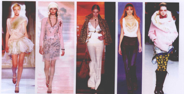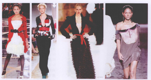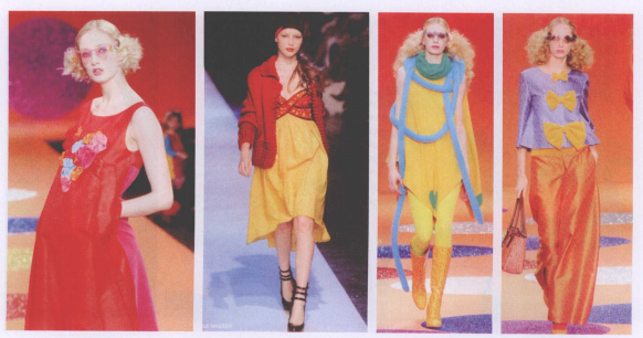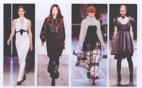 无彩色与有彩色的配色方法是指通过无彩色的黑白灰与其他有彩色进行配色的一种方法,这种配色是最容易掌握的配色方法,无论有彩色的纯度、明度、色相怎样变化,都会给人稳重、活泼的印象,这种配色在服装配色中应用还要讲究面积和形状的大小。白色的裙子搭配红色的外套,虽然红色外套的饱和度很高,但白色能够起到内敛作用,两种颜色搭配给人一种悦目的感觉。虽然上衣的色块多而且没有规则,但是整体大面积的黑色完全压住了色块的跳跃,在稳重中给人活泼的效果。黑色礼服上的红腰带,既醒目又让整体的设计不会显得沉闷。紫色调的装饰线因为面积小,没有跳跃的感觉,同时让灰色的服装增添了活力。