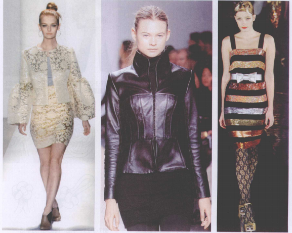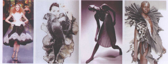 线在服装中运用非常广泛,根据作用可分为轮廓线、结构线、分割线、装饰线等。线的运动可以产生丰富的变化和视错感,比如我们可以通过分割线强调比例,还可通过排列的线条而产生平衡。在服装的造型上,服装的轮廓线、衣褶、省道都体现了线的特征。我们在进行服装设计时,通过线的反复、交叉、放射、扭转和渐变等构成形式,表现出服装流动、起伏的空间关系以及疏密、虚实、变化的美感形式。线元素在现代服装上主要通过造型线、工艺手法和服饰品来表现。