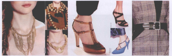 配饰主要包括项链、手链、腰带、围巾、包带、鞋带等 。这里的线元素往往不是单独存在的,是与服装的面元素交叉或者呼应,补充了服装原有的造型。比如普通的连衣裙上系一条腰带,块面被分割了,层次感也增强了 ;冬天穿上厚重的羽绒服,人们就会搭配颜色俏丽的围巾等,都是这个道理。