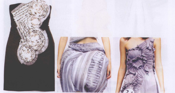 当我们丢弃—张废纸时,会随手将纸一揉,那不经意的瞬间便创造了立体。其原因是纸的形态发生了方向上的转折。如果纸面出现裂缝,立体的空间扩展则更大。由此启发我们运用所掌握的构成原理,加以适当的切割,创造出面材的立体造型。就像塑料发卡,经切割翻卷后便形成了优美的造型。那么服装中的面料也可通过切割翻转来改变形态。