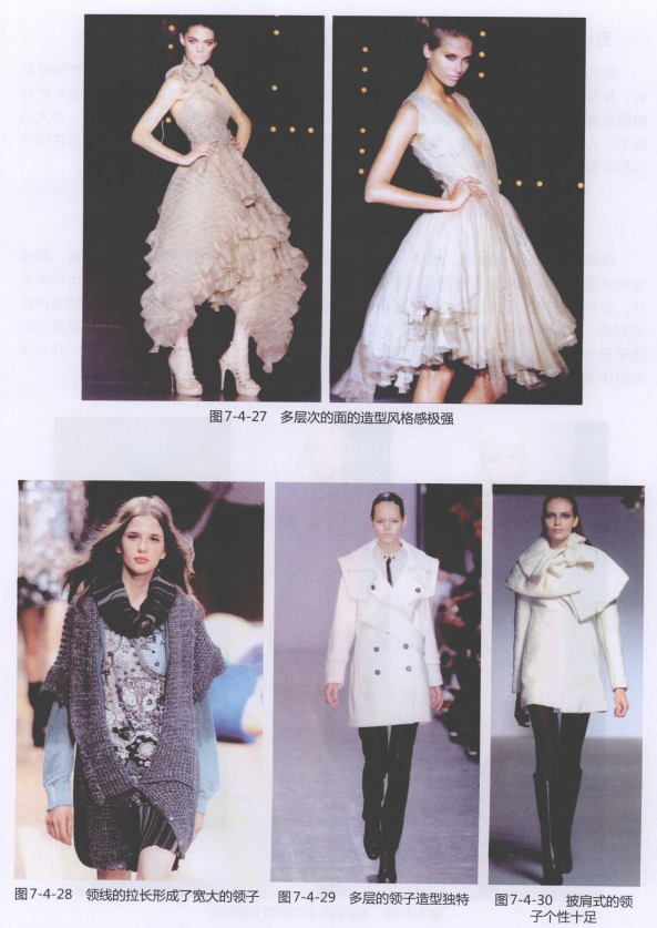 而的造型构成是在服装立体形上利用面形材料,以重复、渐变、扭曲、面层等构成形式,使服装立体具有虚实量感和空间层次感。面的造型构成首先体现为面料裁片,裁片是构建服装整体的主体材料,决定着服装的风格和特点。其次表现在围巾、披肩、包袋、夸大的领子、大帽子等配饰上。对于整体服装来讲,面的造型构成能够起到与服装上的零部件相呼应和丰富服装造型的作用。主要体现在以下几个部分 ∶