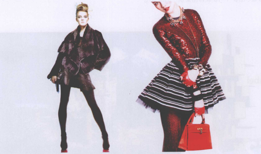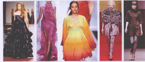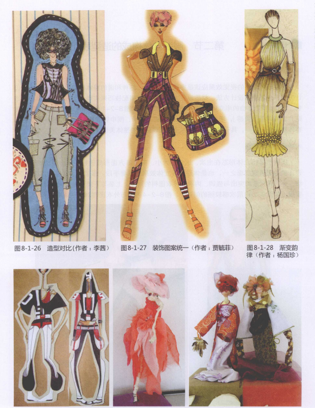 在服装设计中,可以运用分割、发射、渐变、群化等表现方式强调服装的韵律感。如增加裙体的层次、线条(装饰线、拉链、流苏等)的排列、装饰物的群化;立体化的层次递进、图案的反复出现作为服装边缘装饰、纽扣的群化现象、面元素整齐地排列;服装上的叠领、褶边、服装裁片的层层重叠;不同面料的多层拼贴与重叠等。