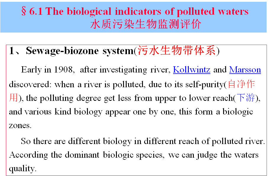 6.2 The biological indicators of polluted waters(水质污染生物监测评价)
