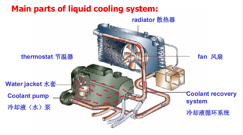 This system consists of several interdependent parts that function together to maintain proper engine temperature. The parts include: radiator, fan, coolant recovery system, coolant pump, water jacket, thermostat, pressure cap, soft plugs.To dissipate excess engine heat, the cooling system performs four function: 1) absorption 2) circulation 3) radiation 4) control