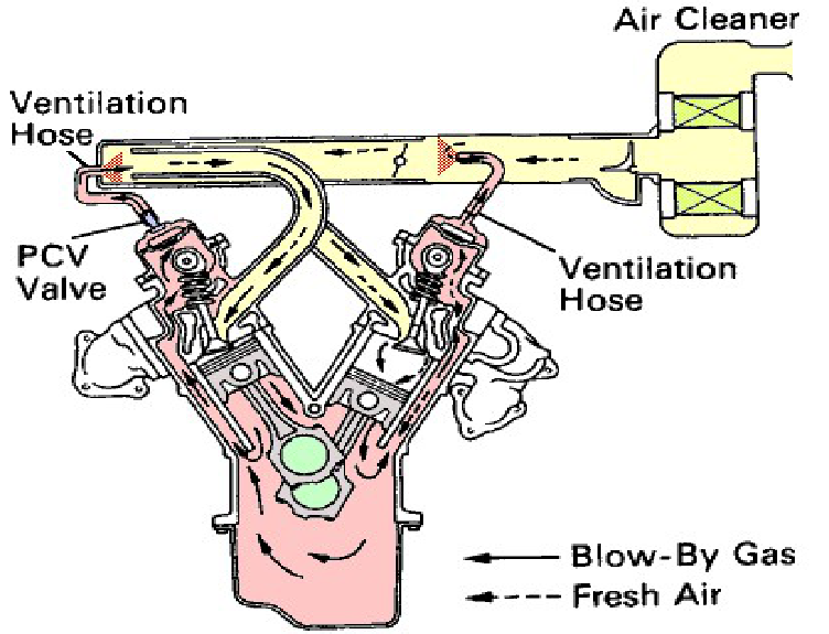 The purpose of the positive crankcase ventilation (PCV) system is to take the vapors produced in the crankcase and piston blow-by, and redirect them into the air/fuel intake system to be burned during combustion.