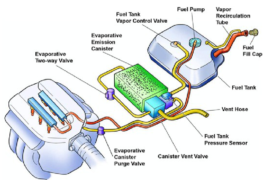 The function of the fuel evaporative control system is to trap and store evaporative emissions from the gas tank and carburetor. A charcoal canister is used to trap the fuel vapors. The fuel vapors adhere to the charcoal, until the engine is started, and engine vacuum can be used to draw the vapors into the engine, so that they can be burned along with the fuel/air mixture.