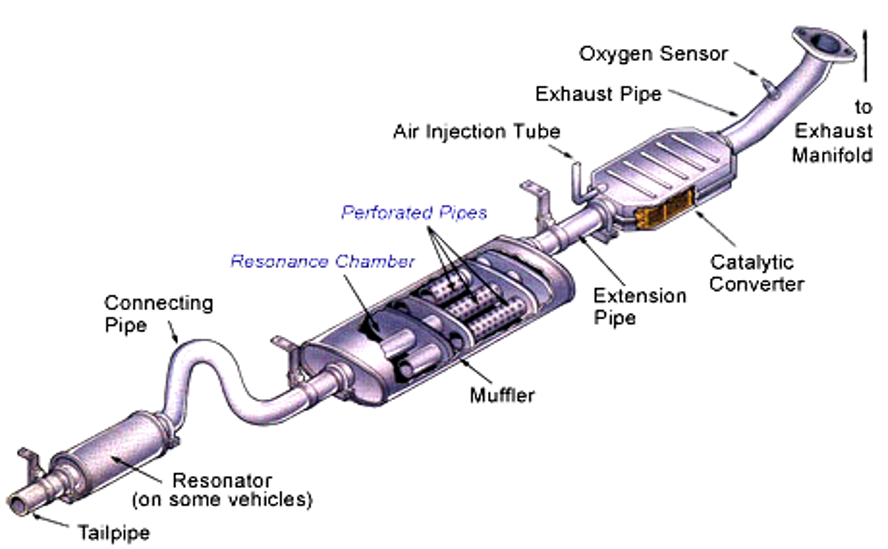The exhaust system has one or two exhaust manifolds, and an exhaust pipe, intermediate pipe, and tail pipe. The exhaust manifold collects exhaust from the engine's cylinders.The exhaust pipe, intermediate pipe and tail pipe carry exhaust to the back end of the car.The mufler quiets engine noise.