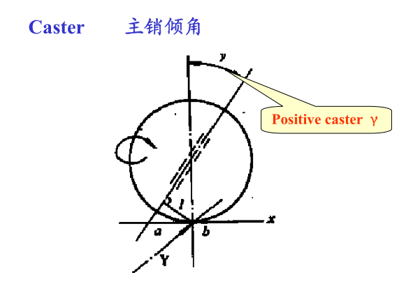Caster is specified as the angle by which the steering axis ( kingpin line ) deviates from the vertical when viewed from the side, or as that distance on the road surface by which the wheel contact point trails the point at which an extension of the steering axis meets the road surface.
