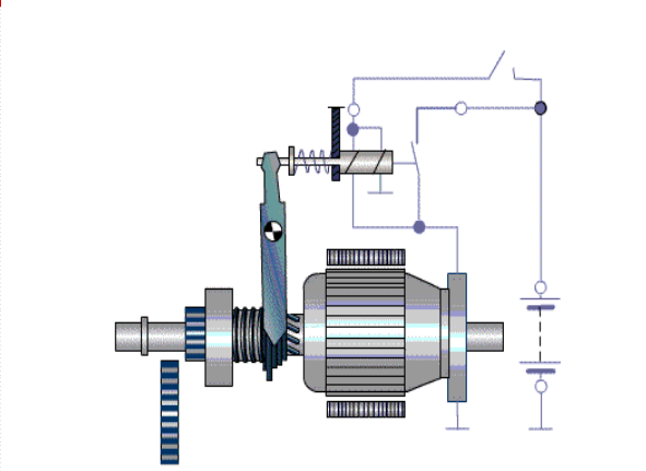 current flows from the battery to the starter motor, and the crankshaft begins to rotate. When current stops flowing to the solenoid, the bottom of the shift lever moves back. This disengages the pinion gear from the ring gear.